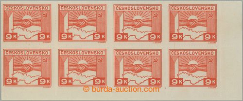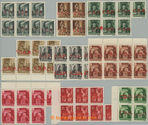 1561 nh imagePhilately. RIMAVSKA SOBOTA / comp. of 9 blocks various values 1f - 1P with red overprint Czechoslovak Post.; mint never hinged, sporadically minor faults (povolena perf, pokrceni paper) and minor gum fault, in blocks rare usage (Image) (Image2) (All Images)