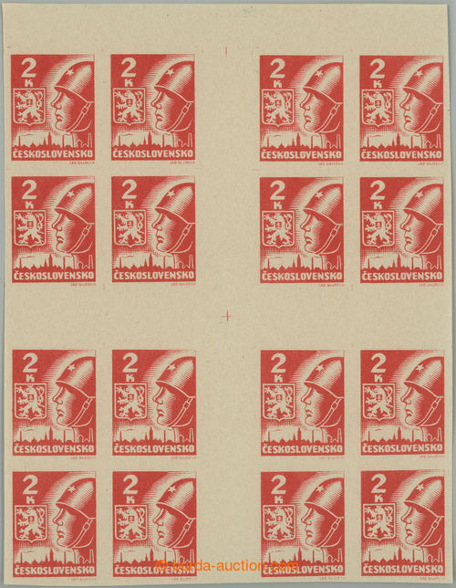 1568 nh imagePhilately. Pof.353+353a, comp. 2 pcs of bloks of four, 1x in/at hnedokarminove color with lower margin and 2x partially omitted pin hole + 1x block of four in light carmine color; mint never hinged, block of four light with zrnkem in paper and minor gum fault (Image) (Image2) (All Images)