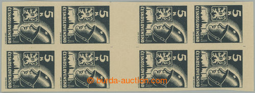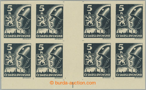 Philately. DESKOVE ZNACKY / Pof.355a Mv(4) RE plate mark, 5 Koruna grey-black, block 2 joined horiz. 4-stamp gutters with lower margin and retouch plate mark A1, plate D; very nice quality mint never hinged, nice significant