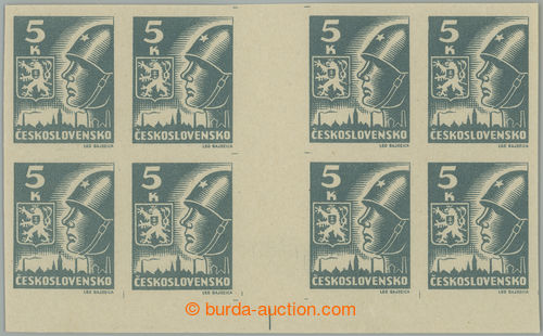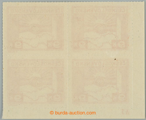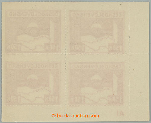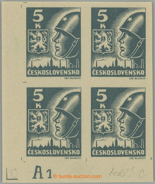 Philately. DESKOVE ZNACKY / Pof.355b plate mark, 5 Koruna light grey, LL corner blk-of-4 with plate mark A1; mint never hinged, nice significant shade light grey! (Image) (Image2)