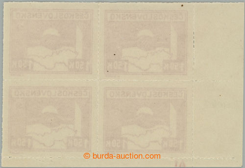 Philately. DESKOVE ZNACKY / Pof.353a plate mark, 1,50 Koruna light carmine, LL corner blk-of-4 with plate number A1, plate 1; mint never hinged, nice shade! (Image) (Image2)