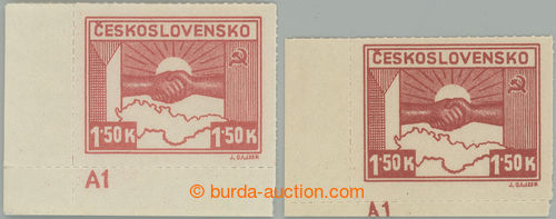 Philately. DESKOVE ZNACKY / Pof.353 plate mark, 1,50 Koruna brown-carmine, comp. 2 pcs of L bottom corner stamp. with plate mark A1 (1) and A1 (2), various shades; mint never hinged (Image) (Image2)
