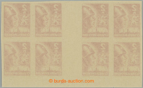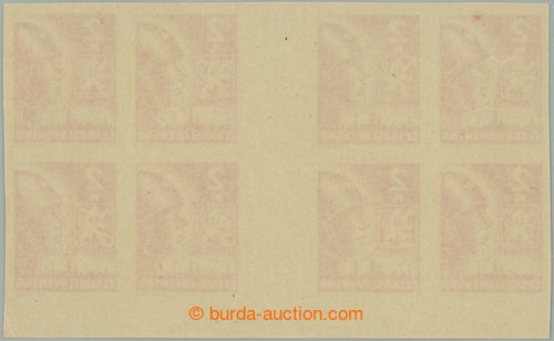 Philately. DESKOVE ZNACKY / Pof.354 Mv(4) plate mark, 2 Koruna light red, block 2 joined horiz. 4-stamp gutters with lower margin and plate mark A1, plate D; 1x production thinned paper at upper margin, otherwise very nice quality