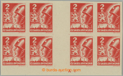 Philately. DESKOVE ZNACKY / Pof.354a Mv(4) plate mark, 2 Koruna brown-red, block 2 joined horiz. 4-stamp gutters with lower margin and plate mark A1, plate D; very nice quality mint never hinged, nice deep shade (Image) (Image2)