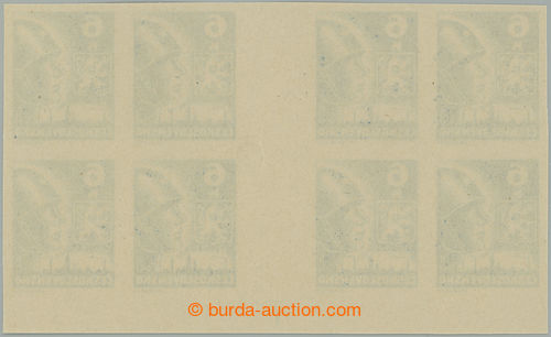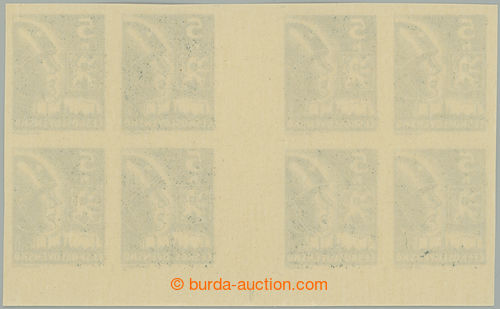 Philately. DESKOVE ZNACKY / Pof.355b Mv(4) RE plate mark, 5 Koruna light grey, block 2 joined horiz. 4-stamp gutters with lower margin and retouch plate mark A1, plate D; small minor gum fault in margin, otherwise very nice quality