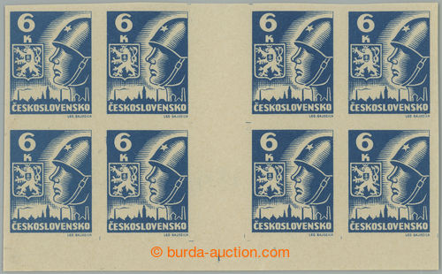 Philately. DESKOVE ZNACKY / Pof.356a Mv(4) RE plate mark, 6 Koruna dark blue, block 2 joined horiz. 4-stamp gutters with lower margin and retouch plate mark A1, plate D; very nice quality mint never hinged, nice significant shade (Image) (Image2)