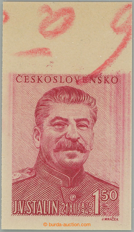 Philately. PLATE PROOF Pof.531, Stalin 1,50Kcs, stamp. with upper margin, plate proof definitive gravure in/at repaired carmine color on yellow paper with gum, handwritten printing notice in margin; without defects (Image) (Image2)