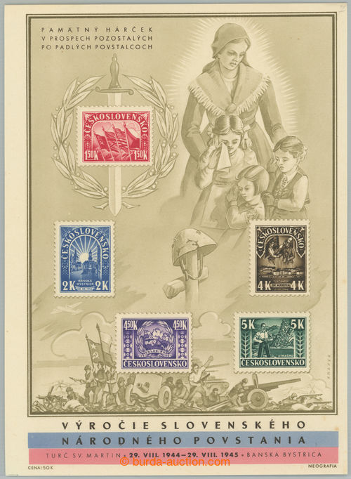 Philately. Pof.A435 production flaw, miniature sheet 1. Anniv Kvetnoveho revolt, production flaw - oblique and L-wards shifted cut miniature sheet, field R; mint never hinged, sought (Image) (Image2)