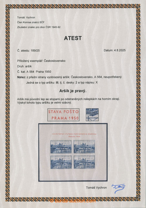 Philately. Pof.A564, miniature sheet PRAGUE 1950, sought type III (!), plate No. 2, type inscription X, combination B/28; repaired hinged, overall fine, certificate Vychron, quite rare, sought by specialists, c.v.. ** 20.000CZK (Image) (Image2)