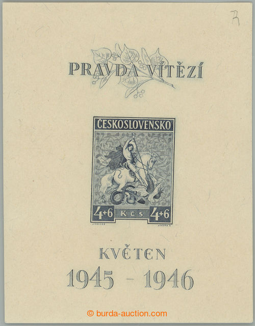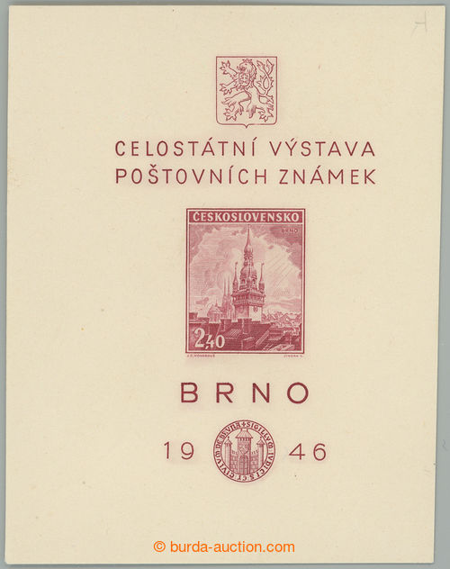 Philately. Pof.A437 production flaw, miniature sheet exhibition BRNO 1946 2,40Kcs, production flaw - expressive shift of cut L; mint never hinged, only grain in paper (Image) (Image2)