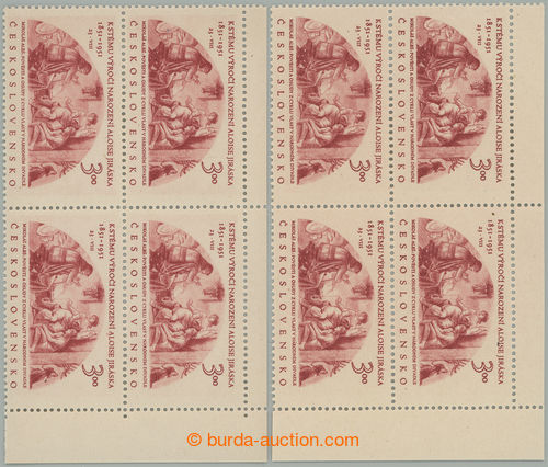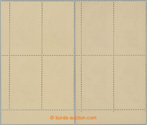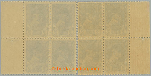 Philately. Pof.609, Jirasek 3Kcs, two UR corner blocks of four, both variants comb perforation - not overlapping resp. 1 presahujici perforation hole to margins counter sheet; mint never hinged, in blocks of four very