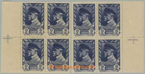 Philately. Pof.386, Moscow 2CZK grey-blue, L and R marginal blk-of-4 with registry dagger from plate 2; mint never hinged, R blk-of-4 quite small toned, very rare plate, missing in most collections! (Image) (Image2)