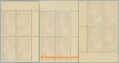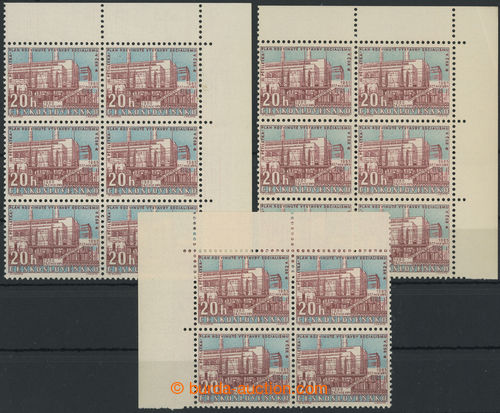 Philately. Pof.1128, 3. petilety plan 20h, selection of 2x UR corner blk-of-6 and 1x UL corner blk-of-4, 3 various editions - light blue, dark blue with light glrilled gum and dark blue with zlutym smooth gum; mint never hinged (Image)
