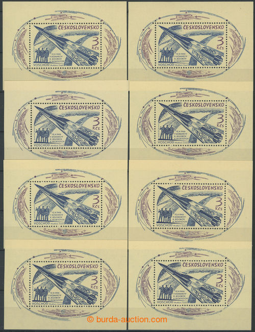 Philately. Pof.A1400, miniature sheet Voskhod I 3Kcs, complete set 8 pcs of miniature sheets, type I.-VIII.; mint never hinged (Image)