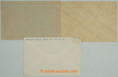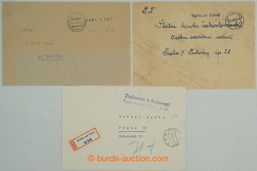 Philately. VYPLACENO V HOTOVOSTI / comp. of 3 letters, from that 1x R, all with cancel. about/by payment in/at hotovosti: CDS HRADEK above N. 5.VI.53, LIPNIK above B. 13.VI.53 and LYSA above L. 16.VI.53; nice selection of (Image) (Image2)