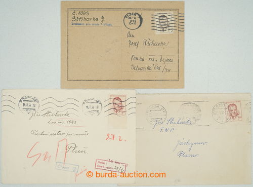 Philately. PLZEn - BORY / comp. 3 pcs of entires - pribeh: 1x preprinted postcard about/by umozneni delivery ration mailing with line blue cancel. Trestnice for man in Plzen with censorship + 2x envelope addressed to to prison in