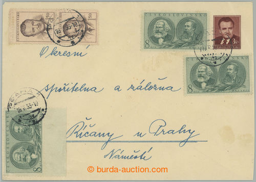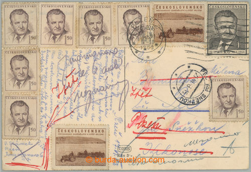 Philately. LAST DAY / postcard sent from Plzen to Pece p./S., franked with. Pof.485 (7x), 717, 730 (2x), MC PLZEn 2/ 18.VI.1953, sent back, addressee unknown, CDS PEC P. S. 21.VI.53; good condition (Image) (Image2)