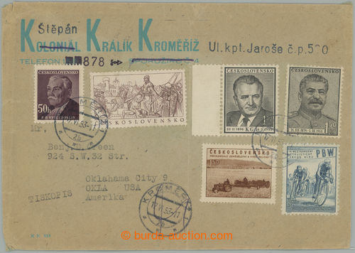 Philately. TISKOPIS plate variety CIZINY / commercial printed matter addressed to to USA, postal-charge 10Kcs franked/paid stamp. Pof.730, 722, 717, 716, 680, 502, CDS KROMeRIZ 1/ 17.VI.53, 1x print also out of stmp with signature,
