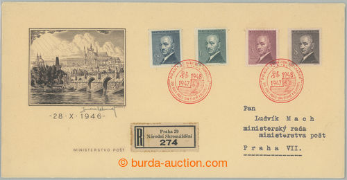Philately. MINISTERSKE FDC / M A/46, Hradcany - black-violet, on reverse with number 169, sent as Reg, mounted stamp. Pof.443-446, red special postmark PRAGUE 29 NATIONAL SHROMAZDeNI/ 29.X.46, Reg label PRAGUE 29/ NS/ No. 274, on