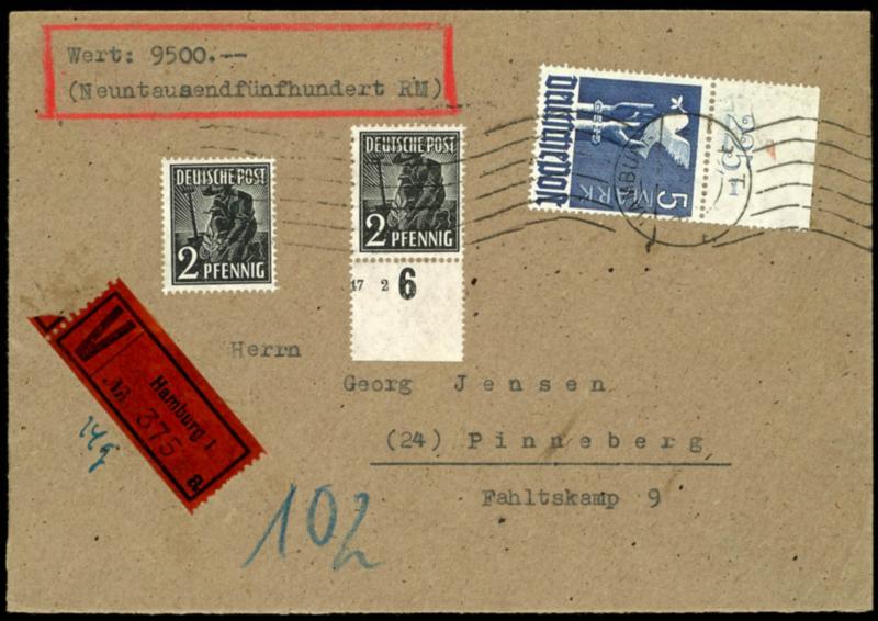 5 Mark dove with upper margin and 2 x 2 pfennigs worker on insured letter over 9.500 Reichmark from Hamburg 19.6.48 to Pinneberg with reverse arrival 21.6, properly franked, just before the currency reform (962,943(2)) 5 Mark Taube mit Oberrand und 2 x 2 Pfennig Arbeiter auf Wertbrief über 9.500