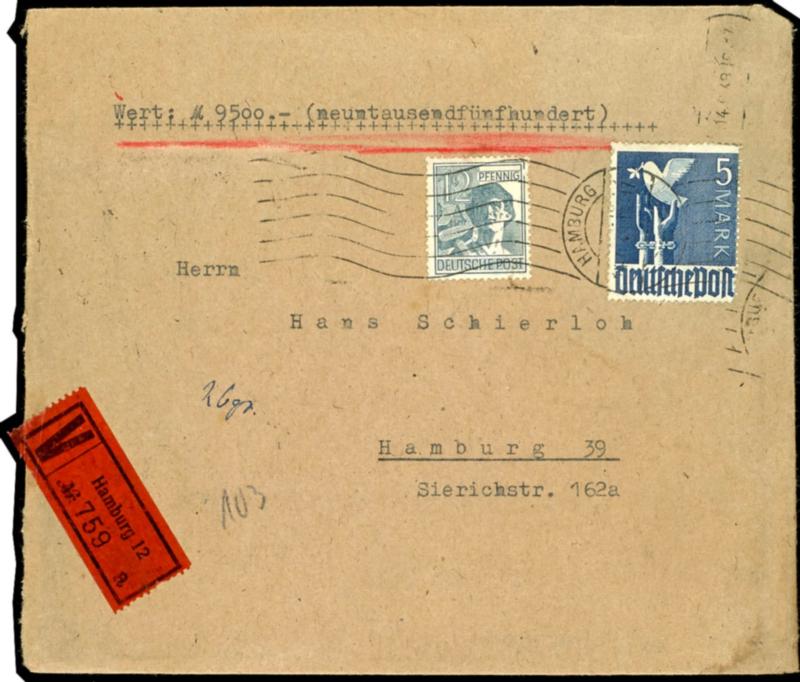 5 Mark dove with 12 pfennigs worker in properly franked mixed franking on insured letter over 9.500 Reichmark in the local usage Hamburg 14.6.48, arrival 15.6.48, good legitimate condition (962,947) 5 Mark Taube mit 12 Pfennig Arbeiter in portogerechter Mischfrankatur auf Wertbrief über 9.500 Rei