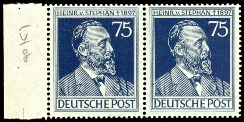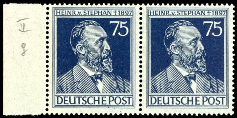 75 pfennigs "50. day of death Heinrich from Stephan", plate flaw I, horizontal pair. left stamp from margin with plate flaw "inverted A", expertized study group, Michel 80.- (964I) 75 Pfennig "50. Todestag Heinrich von Stephan", Plattenfehler I, waagerechtes Paar. Linke Marke vom Rand mit Platten