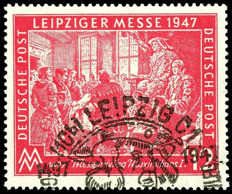 24 pfennigs Leipzig spring fair 1947, perforated L 13 1 / 4 : 13, watermark 7 Z (steps flat falling), cancelled by special cancel "LEIPZIG C1", very fine, photo expertize Hans Dieter Schlegel BPP "the quality is perfect. ", Michel 1.500.- (941IEZ) (page)