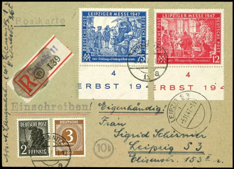 12 pfennigs and 75 pfennigs fair each with lower margin, 2 Pfg worker and 3 Pfg numerals on registered personally distance card CHEMNITZ 4.11.47 to Leipzig, arrival 5.11.47, much text, attest Hohmann ". perfect, extremely rare postage rate" (965/66,913,943) (page)
