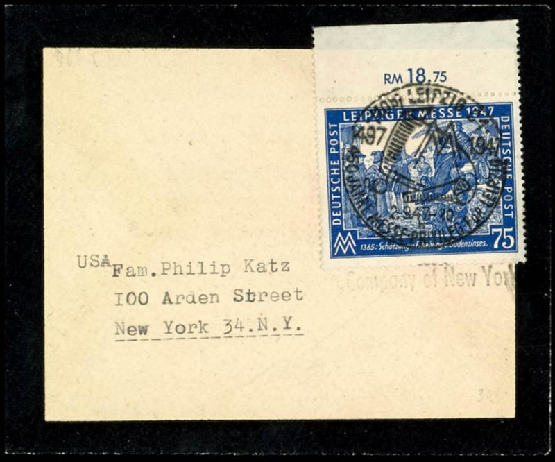 75 pfennigs Leipzig fairground with upper margin in single franking on properly franked, only very short time possible international letter from LEIPZIG 2.9.47 to New York, besides use at the first day of issue, superb (966) 75 Pfennig Leipziger Messe mit Oberrand in EF auf portogerechtem, nur se
