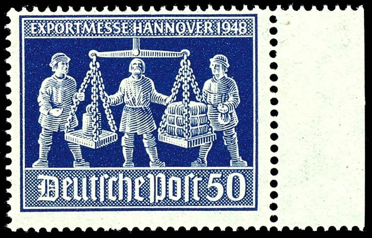 60 pfennigs Leipzig fairground 1947, D-perforation, watermark variety IZ "steps flat falling", mint never hinged from left margin. expertized Schlegel BPP. Michel 150.- (942DZI) 60 Pfennig Leipziger Messe 1947, D-Zähnung, Wasserzeichenabart IZ "Stufen flach fallend", postfrisch vom linken Rand. G