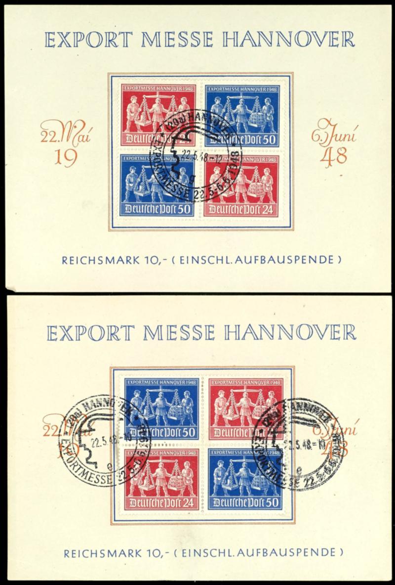 24 Pfg and 50 Pfg "export fair Hanover 1948" as se-tenant blocks of four (both variants), neat cancelled with fair special cancel on decoration pages, photo attests H. D. Schlegel BPP (2024) "genuine, perfect", Michel 360.- (VZd1/2) (page)