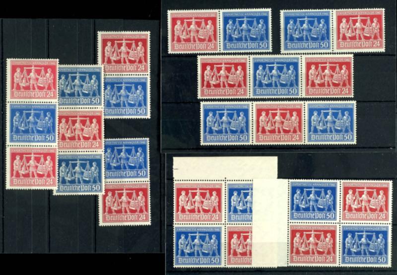24 pfennigs and 50 pfennigs export fair Hanover, all eight known se-tenants in addition to it The Persuaders! different block of four se-tenants, mint never hinged, very fine, Michel 280.- (WZd1/VZd2) 24 Pfennig und 50 Pfennig Exportmesse Hannover, alle acht bekannten Zusammendrucke dazu die zwei