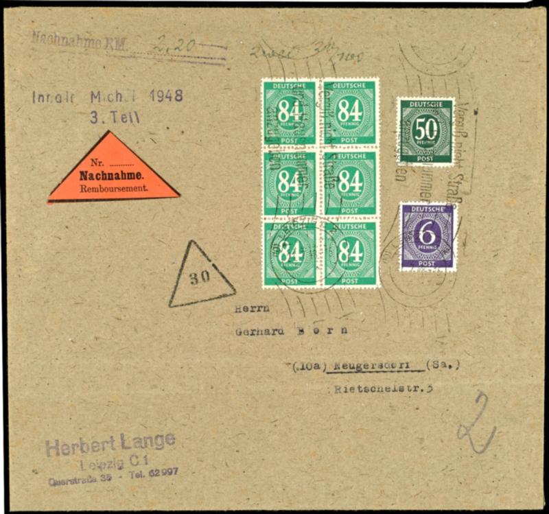 84 Pfg in the block of six with 50 and 6 Pfg numerals on COD printed matter in the weight to 100 g from LEIPZIG 21.7.48 to Neugersdorf, complete mailing bag with at the bottom horizontal trace of crease, exactly properly franked with 5, 60 RM = 56 Pfg in new currency (936(6),933,915) 84 Pfg im Se