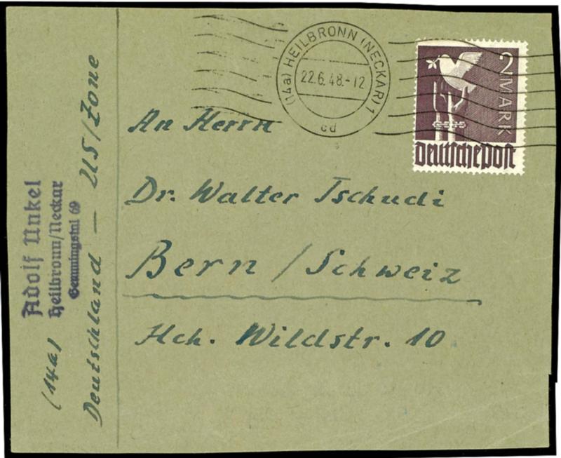2 Mark dove on complete address label a heavy international printed matter to 100 g weight from HEILBRONN 22.6.48 to Bern to Switzerland, unusual single franking, superb (960) 2 Mark Taube auf vollständigem Adressträger einer schweren Auslands-Drucksache bis 100 g Gewicht ab HEILBRONN 22.6.48 nac