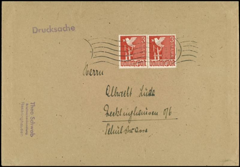 3 Mark dove, two pieces on heavily printed matter in the weight to 500 g in the local usage RECKLINGHAUSEN 22.6.48, superb (961(2)) 3 Mark Taube, zwei Stück auf schwerer Drucksache im Gewicht bis 500 g im Ortsverkehr RECKLINGHAUSEN 22.6.48, Pracht