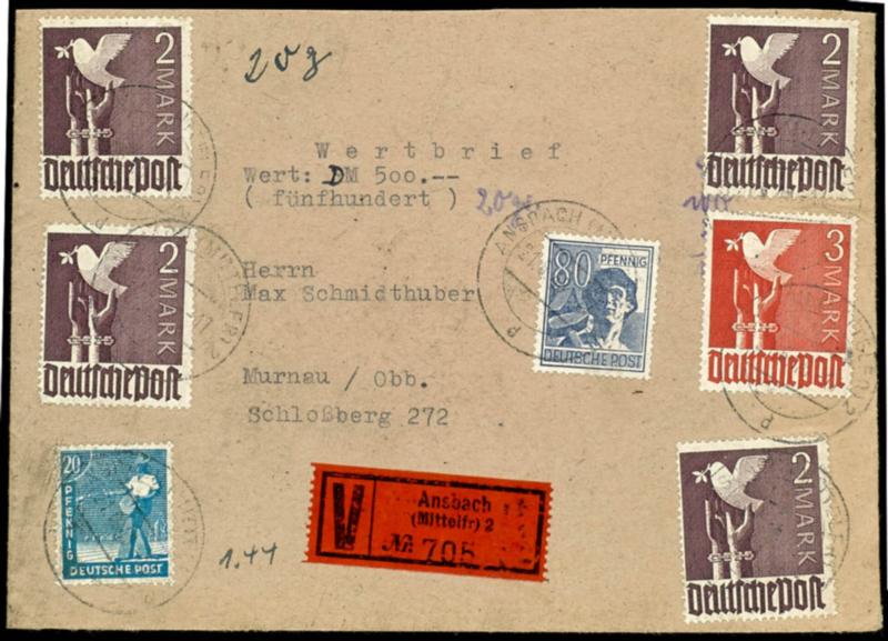 3 Mark dove with 4 x 2 Mark, 80 and 20 Pfg worker as well reverse 8 x 30 Pfg numerals on very unusual insured letter, at the time of currency reform inadmissible, ANSBACH 21.6.48 to Murnau, the indication of currency from 500 RM on DM handwritten corrected, with 14, 40 RM = 144 Pfg properly franked