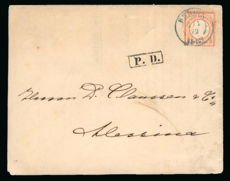 1872, 1/2 Groschen red orange Brustschild with only one irregular perforation otherwise in fine condition, tied to wrapper by blue BERLIN 1.1 1872 datestamp of the first day of issue (FDC), used on probably unique printed matter to Messina, Italy. An important rarity, Sommer certificate (1990).