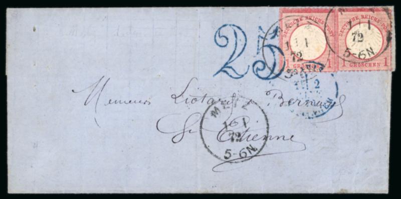 1872 (Jan 1) double rate entire to St Etienne, France franked two Brustschild 1Gr., the right hand stamp slight faults at right due to placement, the first day of issue, tied Metz cds paying the internal postage plus the 25c surcharge levied by the French during this time for mail from the Alsace,