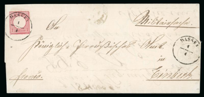 1872, 1 Groschen red (very fine), tied to wrapper by DASSEL 1.1 (1872) date stamp of the first day of issue. FDC s of the Brustschild issue cancelled by reused postmark's of Kingdom of Hannover are extremely rare, in this combination on an envelope used twice it is unique. A spectacular cover, Henn