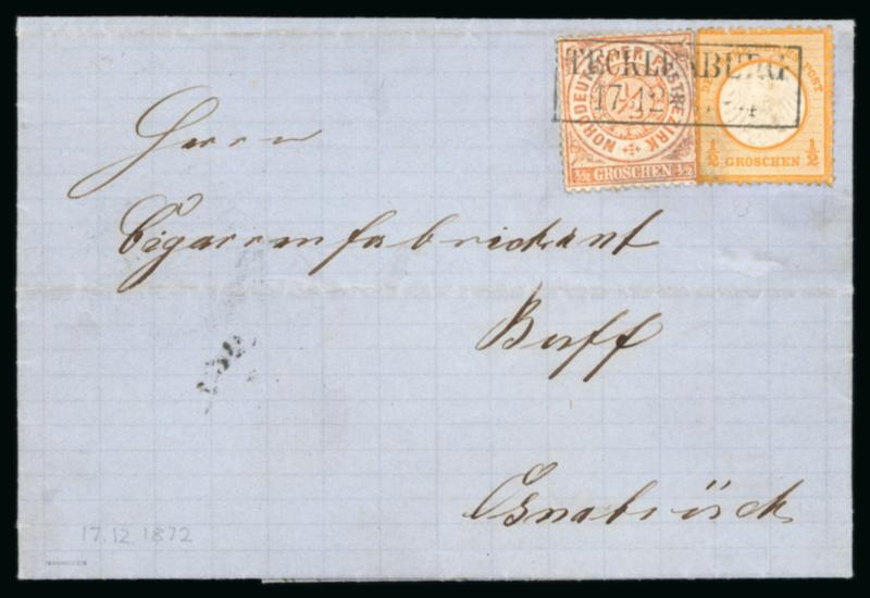 1872 (Dec 17) entire to Osnabruck franked North German Confederation 1/2Gr orange and German empire 1/2Gr Small Shield cancelled by Tecklenburg date stamps, arrival backstamp of same date. An exceptional combination to make the 1gr franking; attractive and very fresh entire, the Brustschild stamp