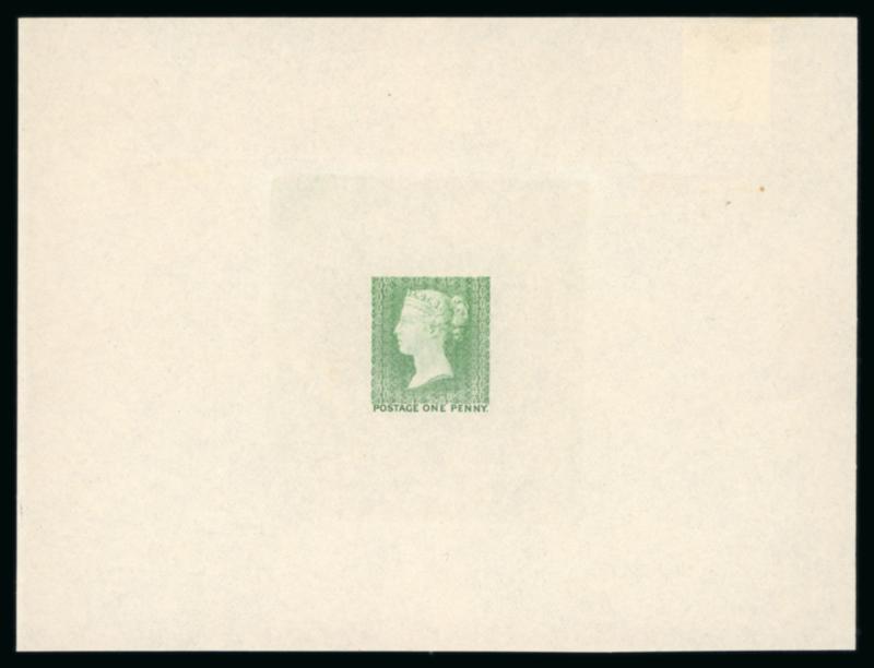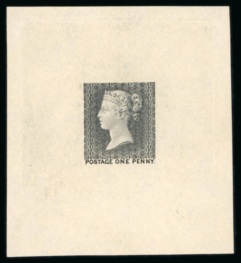 1870 Ormond hill die proof in black on wove paper from the 1st (later rejected) die, showing queens head background and POSTAGE ONE PENNY at foot; an exceptional example of this scarce proof (S.G. from £12'500).