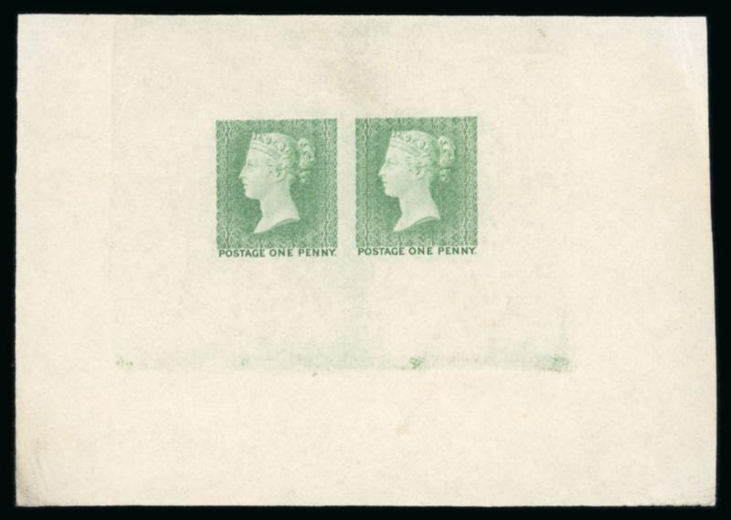 1935 reprint of the first (rejected) die of the One Penny stamp in a pair in yellow-green on unwatermarked cream wove paper without smudges below "ONE" and "NNY"; a very scarce proof (S.G. from £12'500).