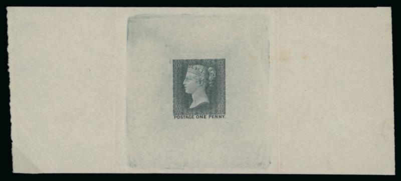 Late Impression of 1d die II proof in black on unwatermarked wove paper (43x70mm) showing reversed "NEW" and "3" above and below the impression; some creasing in the margins clear of the impression though in absolutely no way detracting. Fine and most attractive. Rare. (S.G. from £15'000 in black).