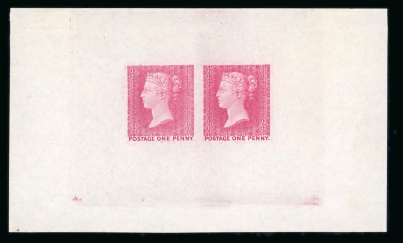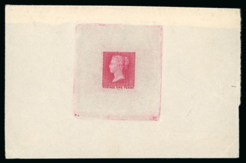 1935 reprint of the first (rejected) die of the One Penny stamp in a pair of rose-carmine impressions on unwatermarked cream wove paper; a very scarce proof (S.G. from £12'500).
