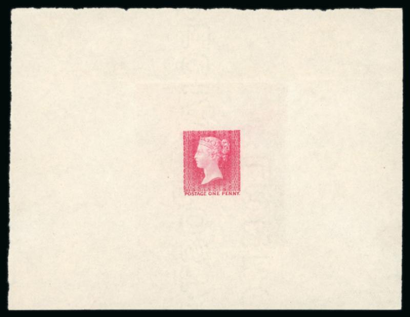 1935 reprint of the first (rejected) die of the One Penny stamp in rose-carmine on unwatermarked cream wove paper; a very scarce proof (S.G. from £12'500).
