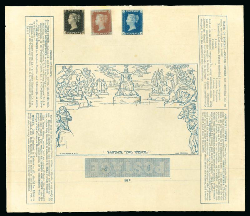 1840 2d Mulready letter sheet, stereo a96, a very fine unused example, the top flap with very fresh mint examples of the worlds first three postage stamps affixed, 1d black AH, 1841 1d red KA, and 1840 2d blue RA (just touched at foot), a most attractive and unusual piece, very rare being one of thr
