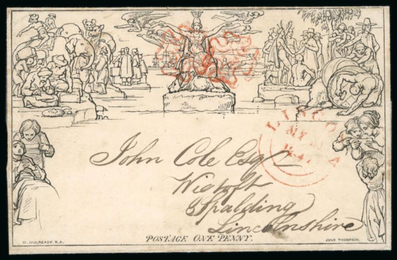 1840 (May 10) 1d Mulready letter sheet, stereo A27, from Lincoln to Holbeach, neatly cancelled by a good strike of the red Maltese cross, showing neat ds at lower left, light tape stain at foot from sealing a tear, a fine example used on the first Sunday, rare (S.G. £10'000).