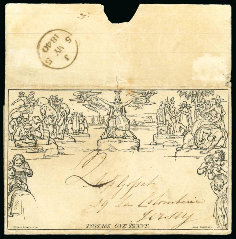 1840 (May 5) Mulready 1d lettersheet, stereo A34, sent to Jersey with ‘’2’’ in manuscript in black for postage due as the Mulready was not yet valid for postage, a fine backstamp of ‘’5 MY 1840’’ which displays nicely on top backflap, a great rarity, this being the only known pre May 6th usage sent