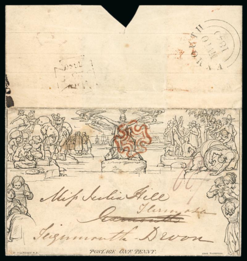 1840 (May 8) 1d Mulready letter sheet, from London to Exmouth then re-directed to Teignmouth on May 10 (first Sunday) showing re-direction fee "P1" in manuscript alongside, neatly cancelled by a good strike of the red Maltese cross, and showing the Exmouth double arc ds on reverse which opens perfec