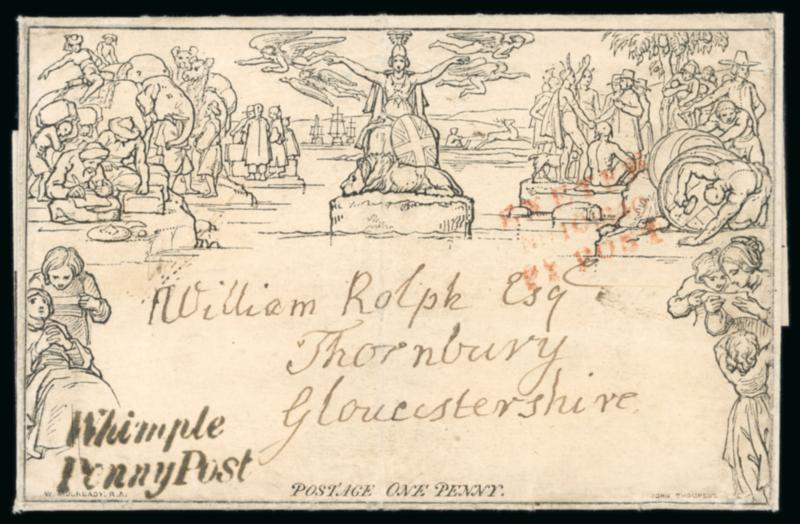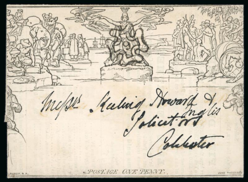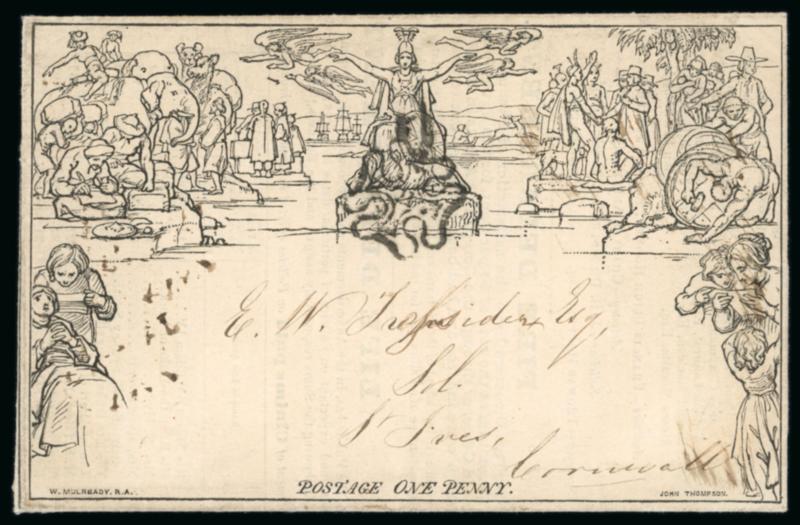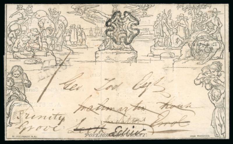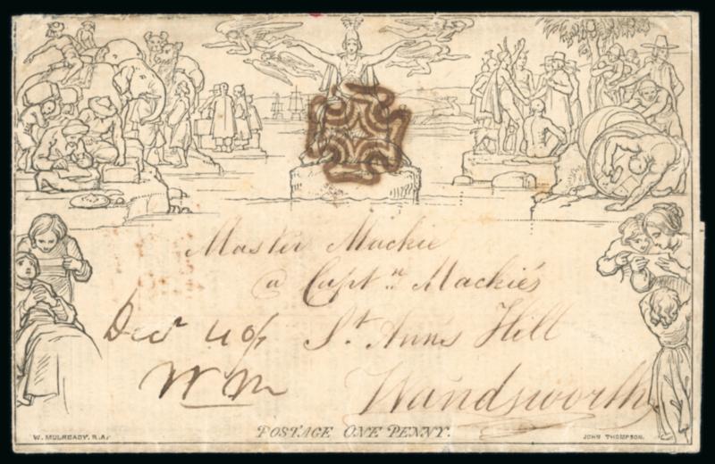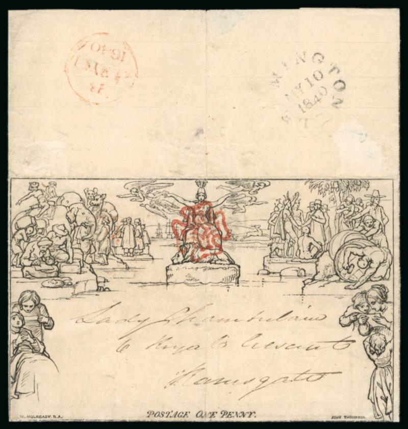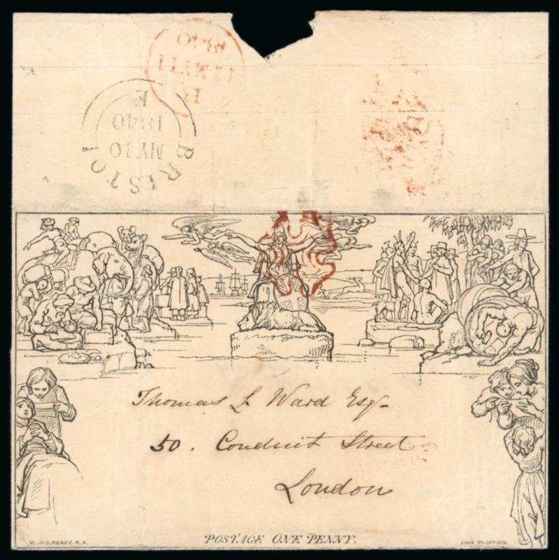 1840 (May 10) Mulready 1d lettersheet, stereo A23, sent from Bristol to London with fine strike of the scarce brown MC, ‘’Bristol MY 10 1840’’ departure strike on the first Sunday of usage. Small internal tear by the elephant, a fine and attractive Mulready with the scarce combination of the brown M